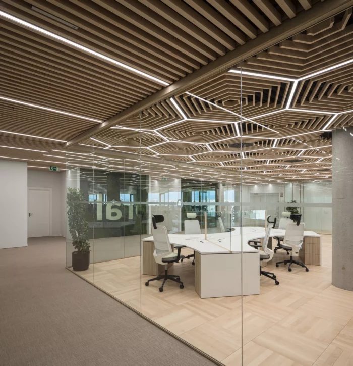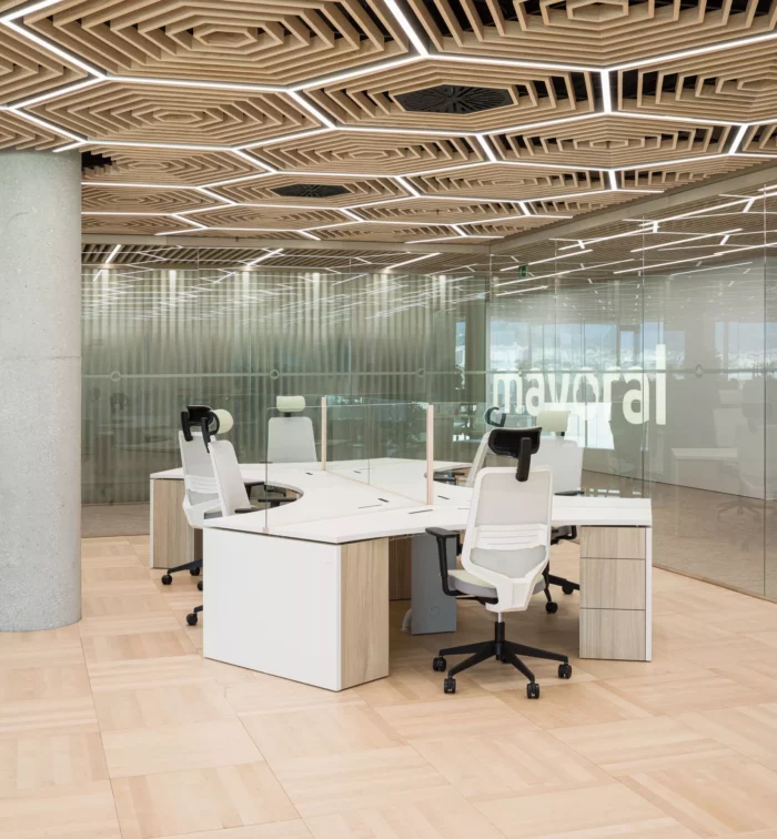 En este proyecto hemos tenido la oportunidad de diseñar todos los detalle desde su distribución hasta el mobiliario. En este sentido, tanto la mesa de trabajo MHEXA como la luminaria LUXHA han sido creadas en exclusiva para este espacio. Ambas piezas parten de un patrón hexagonal que no solo define su identidad formal, sino que también permite organizar el espacio de manera coherente y en armonía con el conjunto del proyecto.